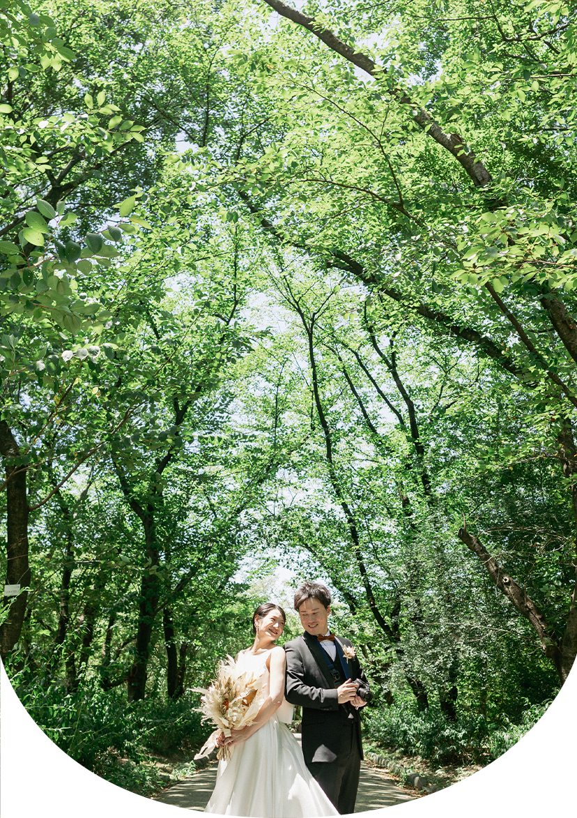 光と緑にあふれるロケーション撮影スタジオの屋上では、緑と陽光を活かし、屋内シーンとはまた違う花嫁の魅力を引き出します。夕焼け時間の撮影もおすすめです。